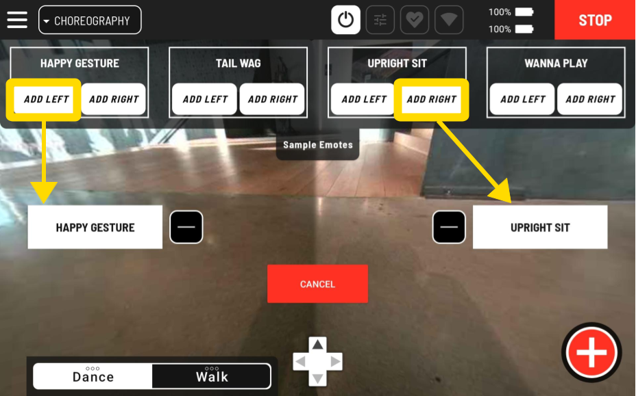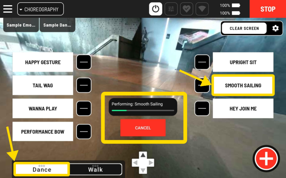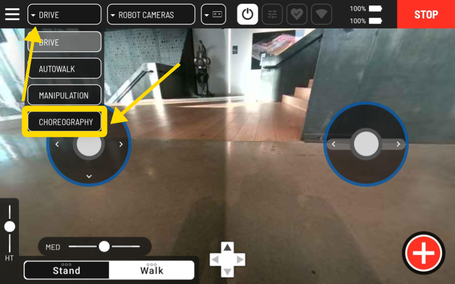 Dances authored and executed using Choreographer can also be played through the tablet using the Choreography drive mode. In addition, Spot comes with a set of pre-uploaded sample dances created by Boston Dynamics which can found under the Sample Dances and Sample Emotes categories when first connecting Spot to a Tablet.