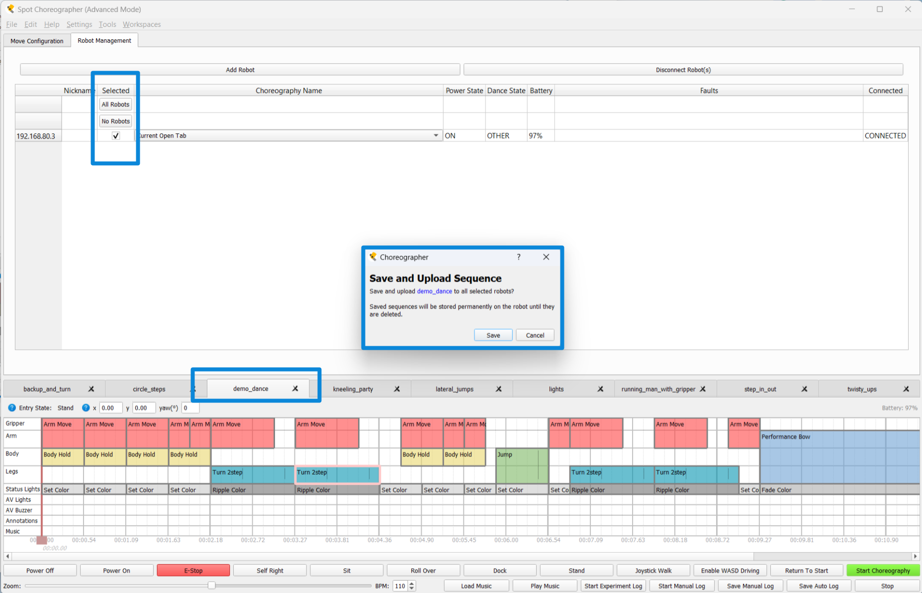 Select the robot connections you wish to upload your sequence to, then make sure the sequence you wish to upload is the current open tab. When these settings are correct, open the “File” menu and select the “Save and Upload Choreography to Robot(s)” option. Press Save.