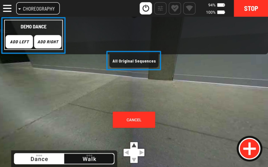 Note: When a tablet does not have hardware joysticks connected for driving the robot, sequence buttons are hidden in modes like “Sit” and “Stand” so the on screen software joysticks may be displayed instead. To make the sequence buttons reappear, select “Dance” mode from the lower left list, or click on any dance dropdown menu.