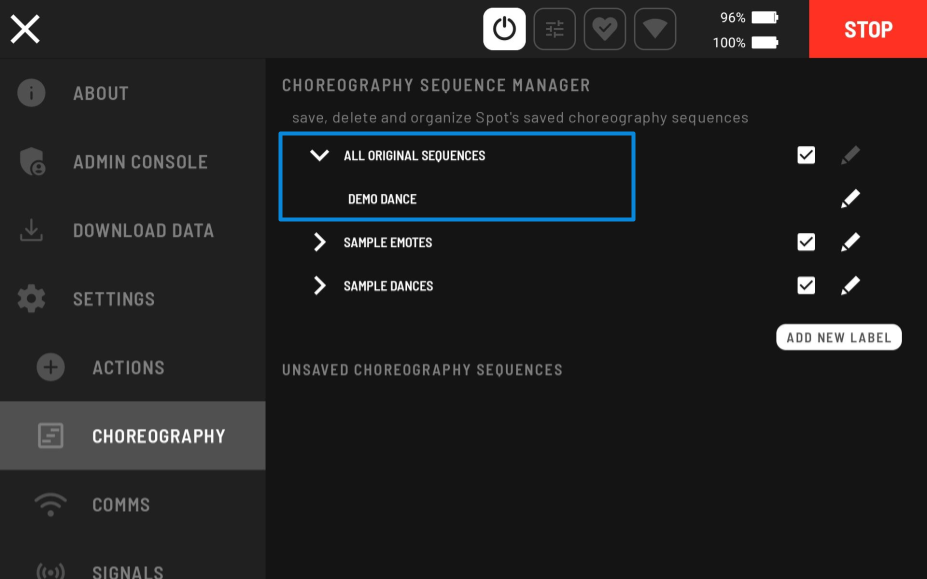 Now connect to Spot through the tablet, and navigate to the Settings section of the Hamburger menu. In Settings select Choreography. All the sequences you uploaded to the robot with Choreographer will appear under the All Original Sequences category.