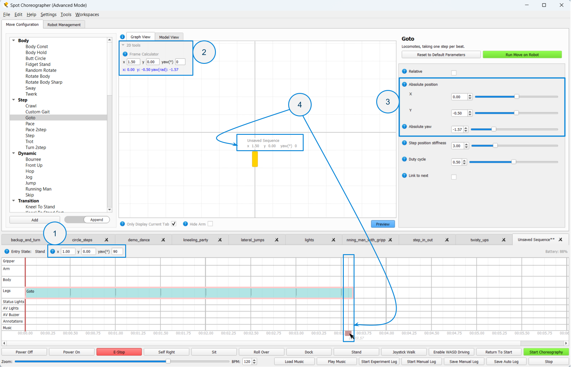 Start Position data does not affect a sequence’s behavior when executed on Spot, but it is a useful documentation tool to help the user remember where to place each robot before it starts a sequence.