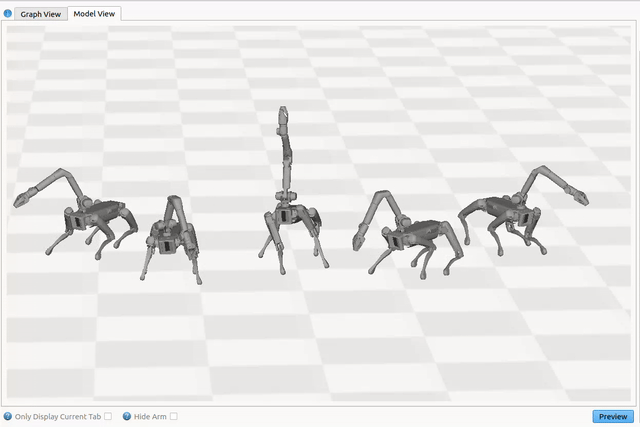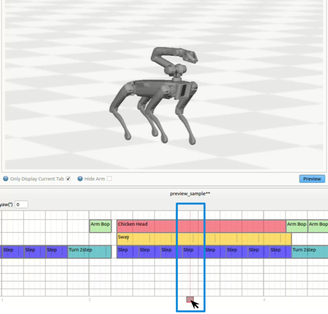 When performing legs moves with wider stances, Spot will often lower it’s body to better perform these movements. This behavior may not be fully captured, or will not be represented as smoothly, in Preview playback.