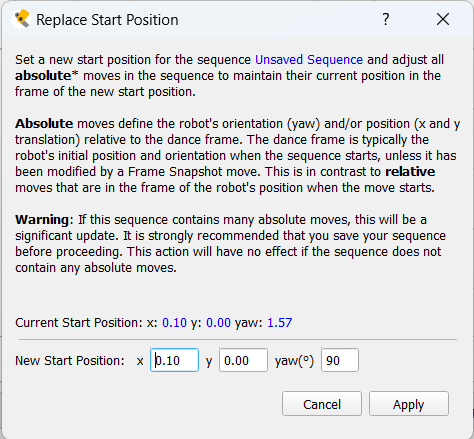 The replace start position tool seeks to cover the specific case where a sequence for a multi-robot dance, containing absolute moves, should now start from a new location in the world but still maintain the same spacing to other robots in the group once the dance starts.
